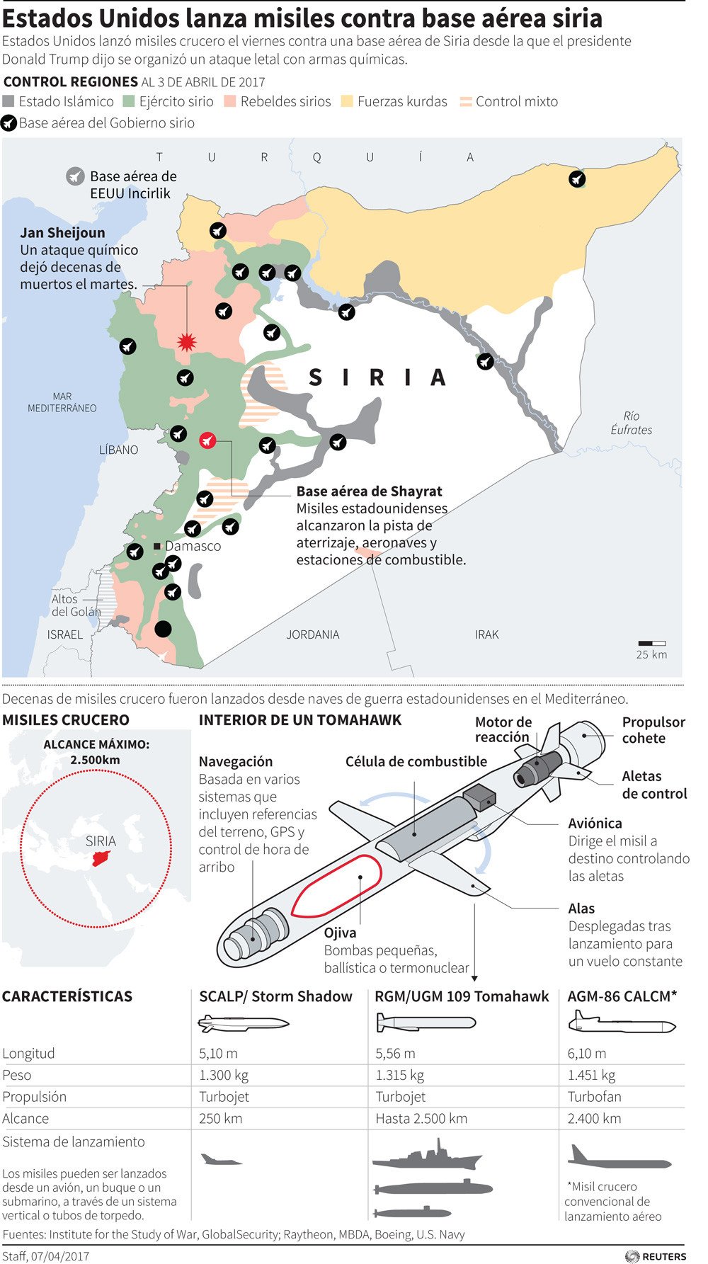 La agencia Reuters ha publicado una infografía sobre la situación militar y las bases aéreas en Siria después del ataque estadounidense lanzado este viernes contra una de ellas. La infografía precisa también las características de los misiles de crucero Tomahawk usados en este ataque, así como las de otros misiles.