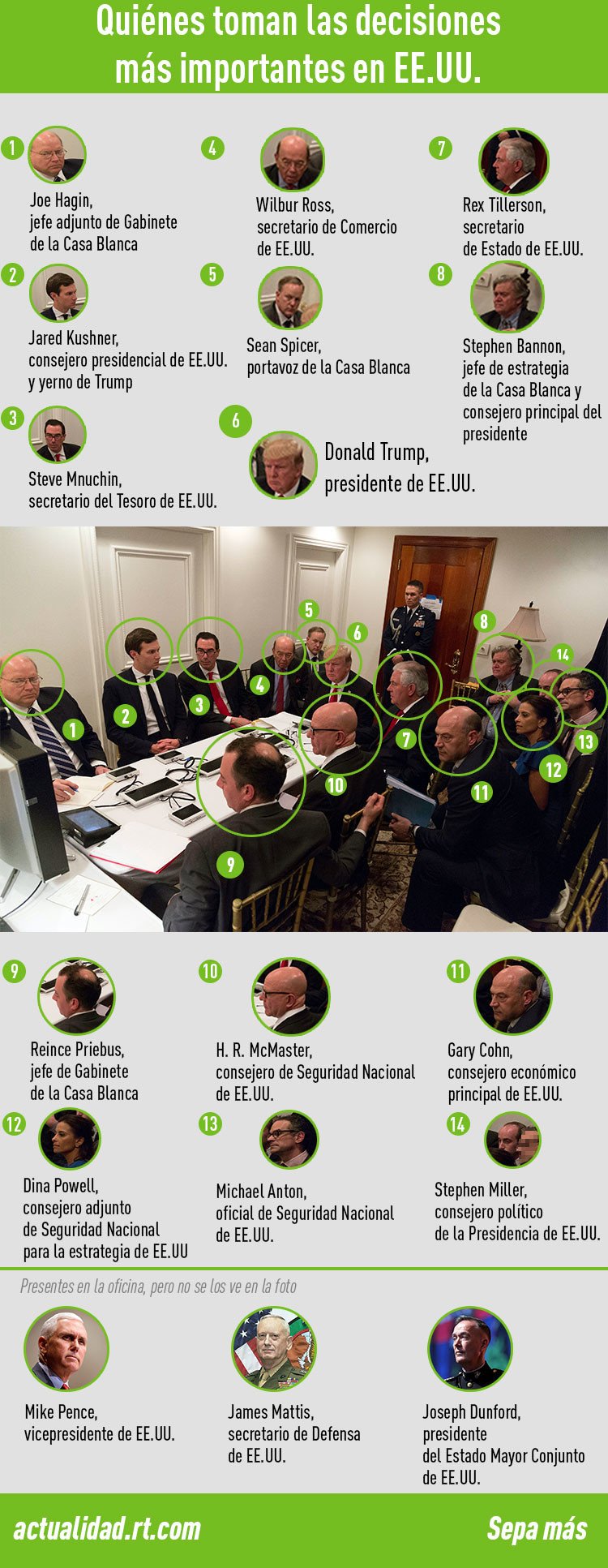En esta ocasión, Donald Trump dirigió el ataque a la base aérea siria de Shayrat. La fotografía fue publicada por el secretario de Prensa de la Casa Blanca, Sean Spicer, quien asegura que fue editada por motivos de seguridad. La misma da una idea de cuáles son los principales actores que toman las decisiones más importantes de EE.UU.