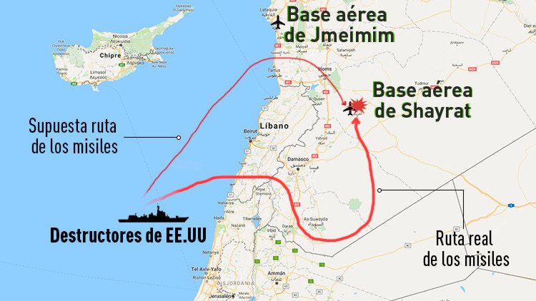Por lo tanto, este es el escenario más probable: los Tomahawk que EE.UU. lanzó desde dos buques ubicados en el mar Mediterráneo entraron en el espacio aéreo libanés y se dirigieron hacia el sur a lo largo de la frontera entre Jordania y Siria para, a continuación, girar hacia el norte y alcanzar la base Shayrat.