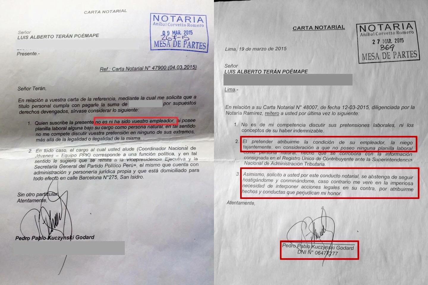 Tras la negativa de atender su caso, envió dos cartas notariadas al empresario, en marzo del 2015, quien le respondió que no había sido su empleador en una primera misiva y en una segunda que no lo siguiera hostigando.