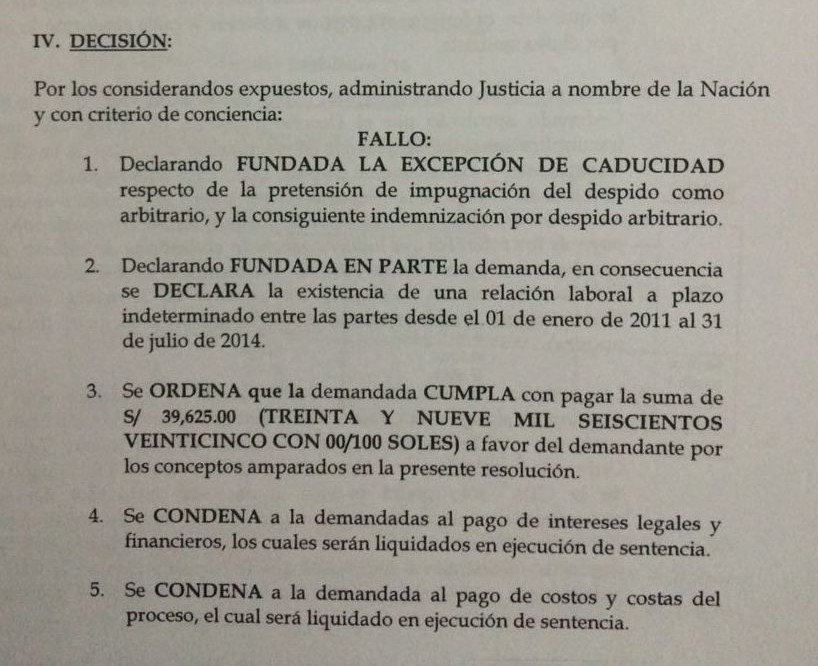 Este fallo determinó que Kuczynski deberá pagarle 39.625 soles (12.000 dólares) a Terán en concepto de la relación laboral entre el 1 de enero de 2011 y el 31 de julio de 2015, que aún no ha sido reconocida por el propio mandatario.