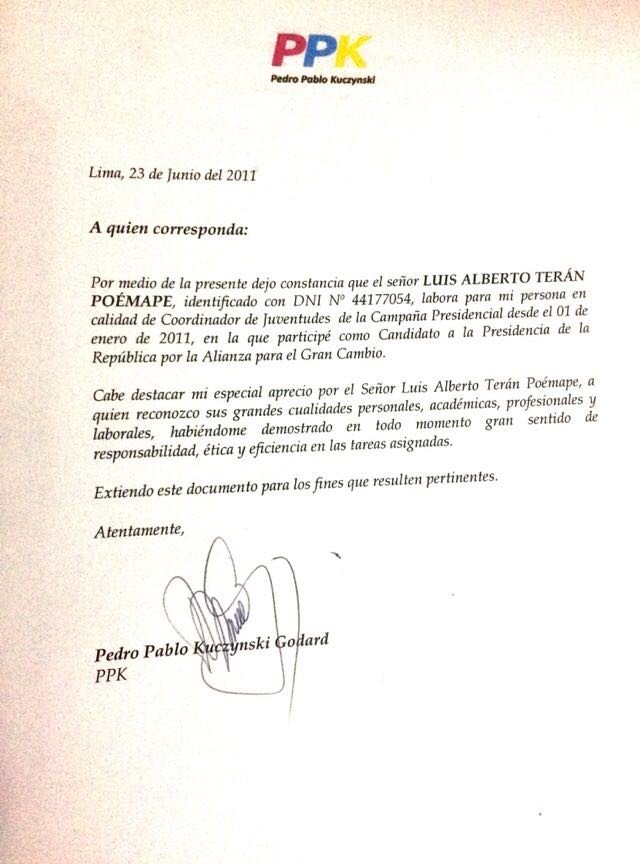 Dos años más tarde, Terán egresó de la universidad y Kuczynski lo invitó a formar parte de su equipo, a partir del primero de enero, cuando comenzaba oficialmente la campaña para las elecciones de abril del 2011.