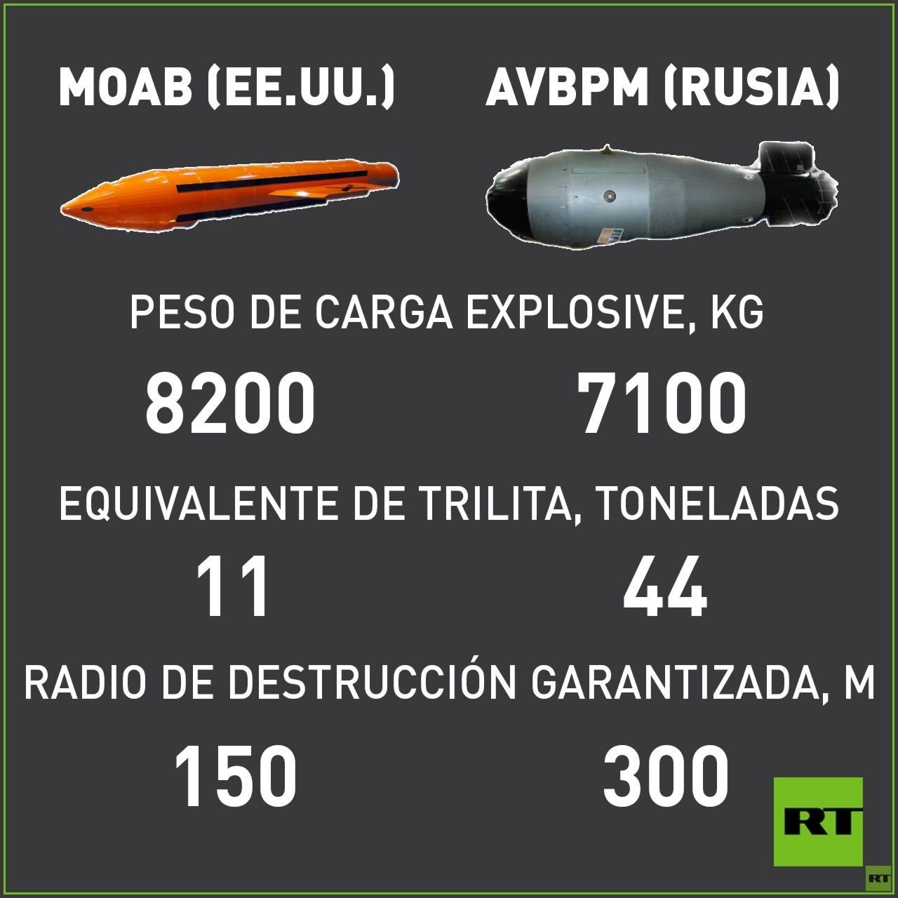Además, la bomba rusa produce un área dos veces mayor de destrucción total y la temperatura que se alcanza en el epicentro de la explosión es el doble que la que se consigue con una GBU-43/B.