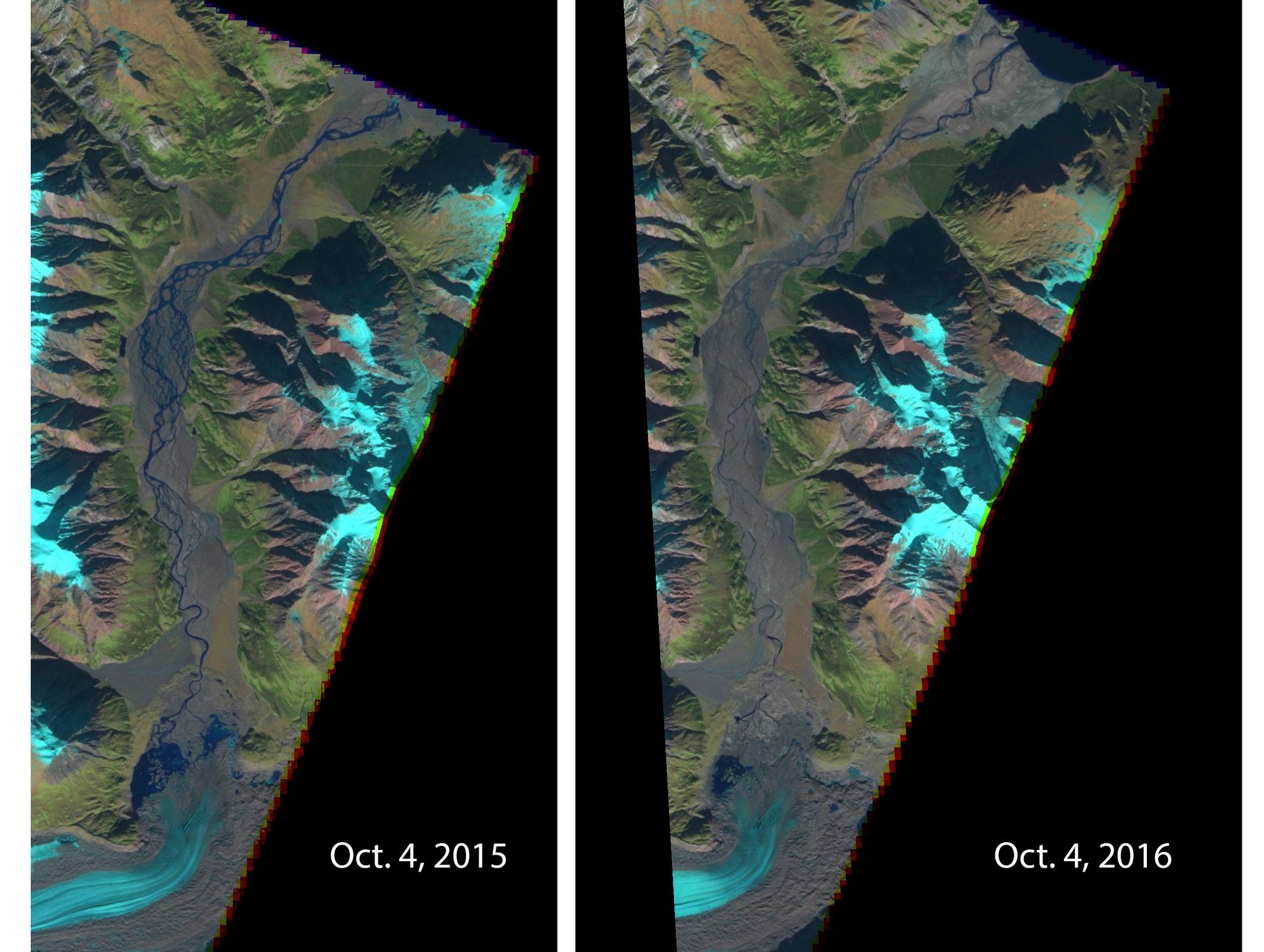 Este cambio radical de corrientes fluviales tuvo lugar a finales de mayo de 2016 y provocó que desapareciera todo un río. La parte delantera del glaciar, derretida como consecuencia del cambio climático, regresó tan arriba hacia el valle que todo su caudal alteró de sentido y se desplazó de un río a otro.