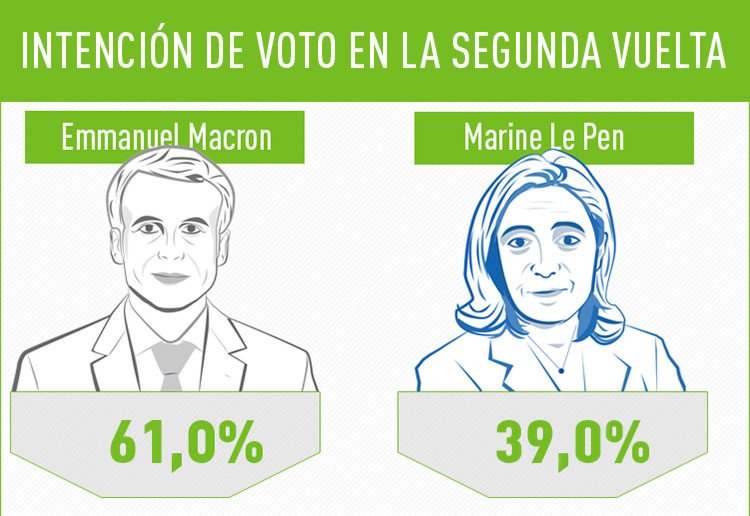 Ahora, de cara a la segunda vuelta, el líder de En Marche! se perfila como el gran favorito para ocupar el Elíseo durante los próximos cinco años. Según la encuesta de Cevipof para 'Le Monde', publicada el pasado miércoles, que acertó la victoria de ambos candidatos, Macron ganaría a la candidata del Frente Nacional por más de 20 puntos el próximo 7 de mayo.