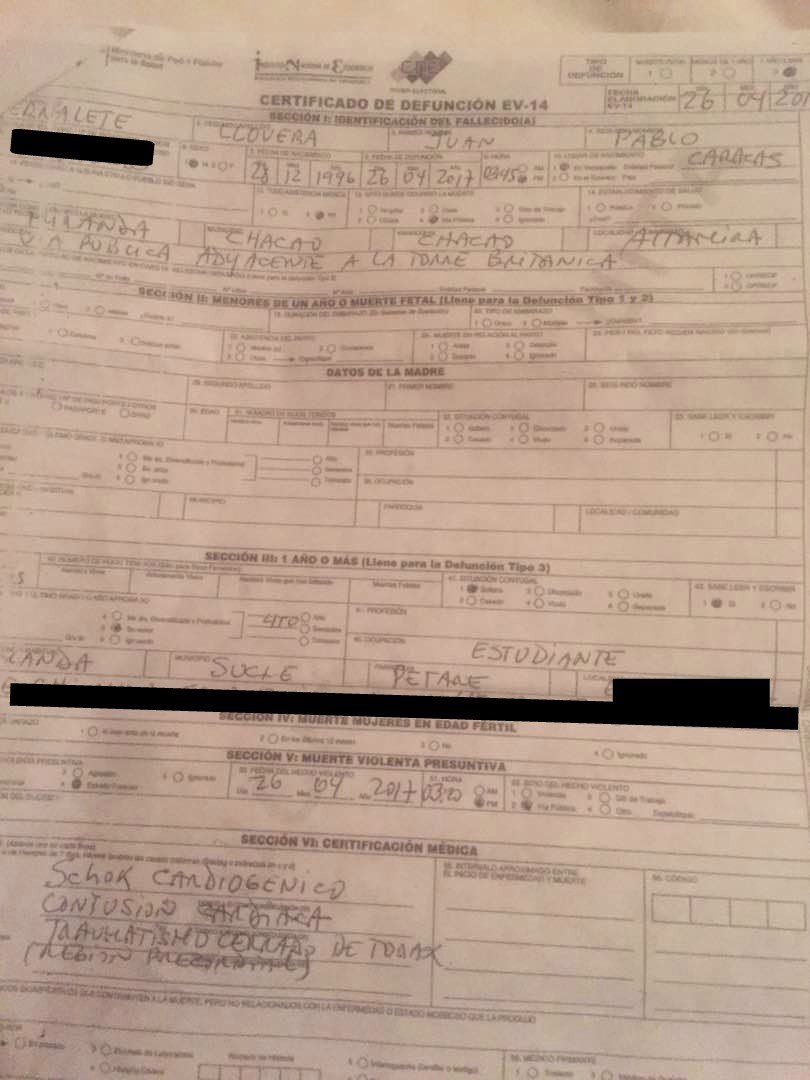 "El cuerpo no presentaba impactos de balas ni impacto de perdigones. Lo que nuestros médicos registraron en el informe fue un fuerte golpe en el pecho (...) Tal vez se haya presentado una confusión porque más temprano habíamos reportado que había llegado una mujer de 58 años con un golpe en la cabeza", indicó citado por el diario 2001.