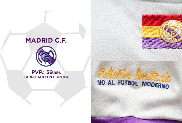 La elástica de esta marca de ropa no lleva la corona en el escudo, pero lleva la bandera de la II República española y un mensaje: "No al fútbol moderno". Según el juez de Plaza de Castilla, la camiseta de 198 es "una ficción que pretende difundir los valores republicanos". Además, el magistrado acusa al club merengue de querer apropiarse del término 'Madrid' y de no saber distinguir Monarquía de República.