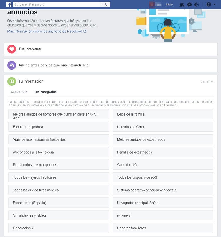 "Te incluimos en estas categorías en función de tu actividad y de la información que has proporcionado en Facebook", reza la descripción de esta controvertida sección. Para ver cuál es el perfil –aterradoramente preciso– que Facebook tiene de nosotros, hay que seguir estos pasos: