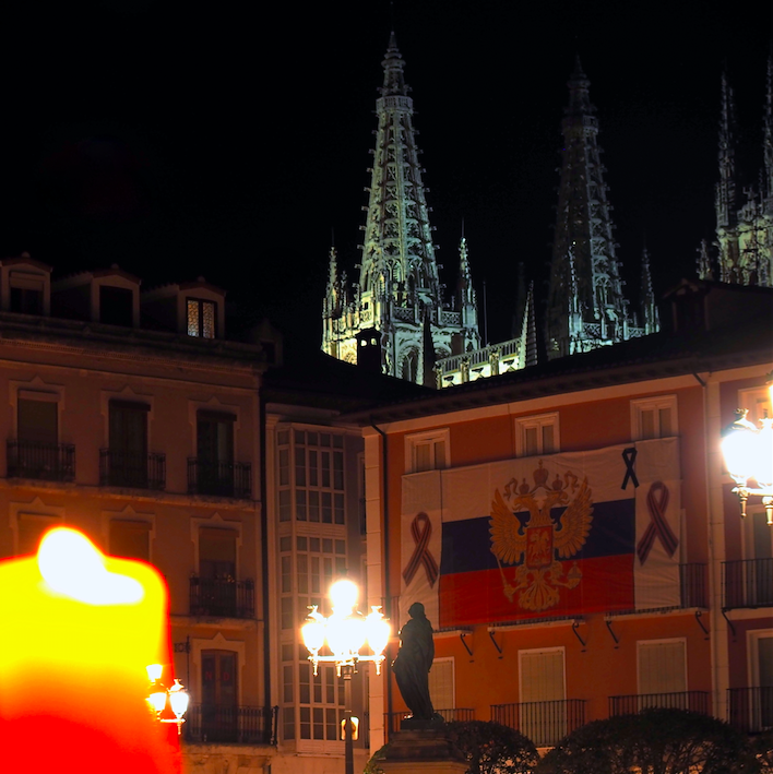 E.D.: No, las colocamos y retiramos de forma puntual, pero hemos recibido presiones y amenazas. Para que te hagas una idea de las presiones. Los empleados de la empresa profesional que nos coloca las banderas, que pago yo encantado, han sido identificados por la Policía secreta. También aparecen artículos con amenazas y con comentarios que dicen barbaridades… ¡Llegaron a hablar de posible operación secreta de Putin en la Plaza Mayor de Burgos! Ya no sabes si tomarte todo esto a broma o qué hacer.