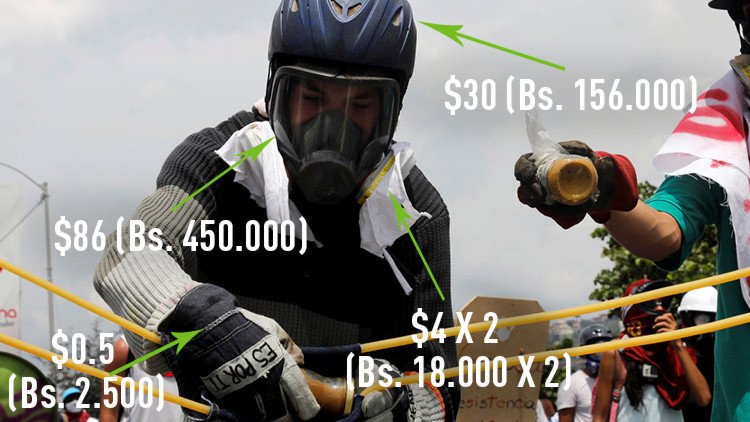 Un joven porta un casco con una cámara personal de alta definición. En sus manos lleva un escudo y en su rostro un máscara antigás. Aunque protesta por la precaria situación en Venezuela, su indumentaria 'para la guerra' cuesta casi un año de salario mínimo en su país.