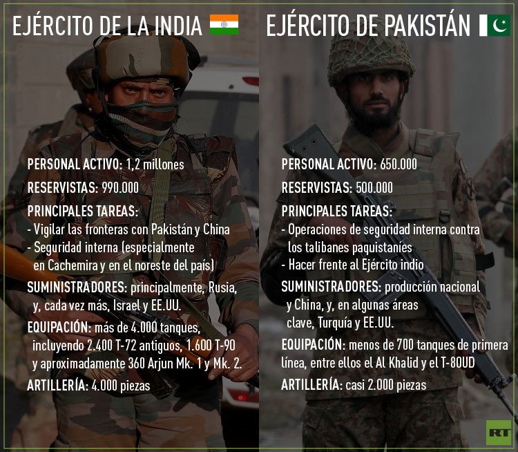 "El Ejército de India y de Pakistán tienen más personal que el Ejército de EE.UU. y se han mantenido alerta observándose el uno al otro desde la disolución del Ejército indio británico en 1947", escribe Kyle Mizokami, escritor especializado en defensa y seguridad nacional en 'The National Interest'. Ambos países se han enfrentado en cuatro ocasiones en los últimos 70 años y, según Mizokami, "puede que lo hagan de nuevo en un futuro".