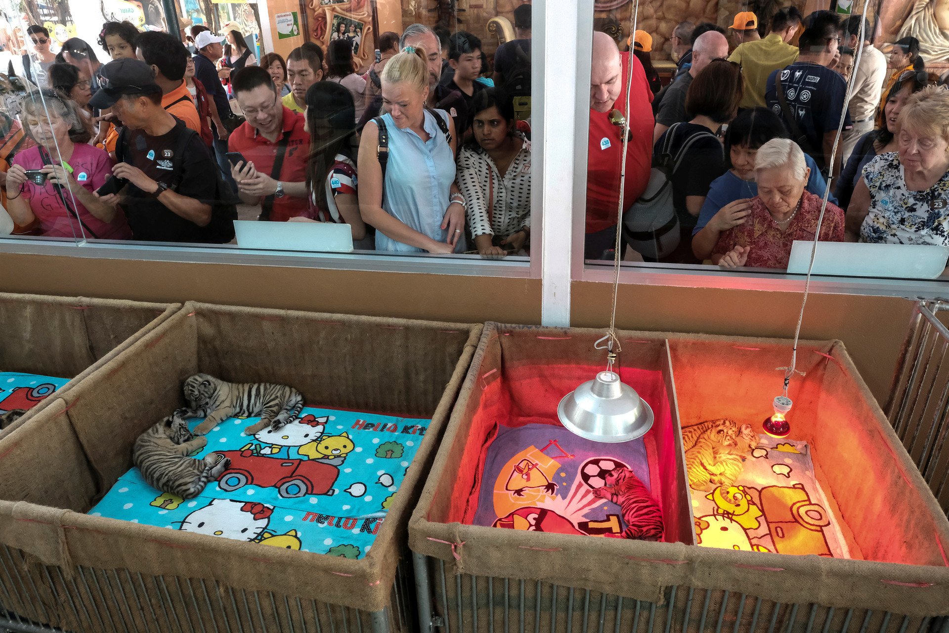 En Tailandia viven unos 1.450 tigres en cautiverio, la mayoría de ellos en lugares turísticos como el Templo del Tigre, cuyos visitantes pagan por jugar con cachorros. Se cree que cuando los tigres alcanzan la madurez sexual y ya no pueden ser manejados con seguridad, muy frecuentemente 'desaparecen' para ser vendidos en el mercado negro por hasta 50.000 dólares, según Karl Ammann, director de documentales sobre la industria de la cría de tigres.