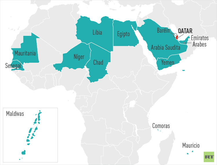 - El 5 de junio, Arabia Saudita, Egipto, EAU y Baréin cortaron lazos diplomáticos con Catar por considerar que ese país proporciona ayuda y financiación a organizaciones terroristas. Posteriormente, Yemen, Libia, Maldivas, Mauricio, Mauritania y Comoras se unieron a esta medida, mientras que Yibuti redujo su representación diplomática en territorio catarí.