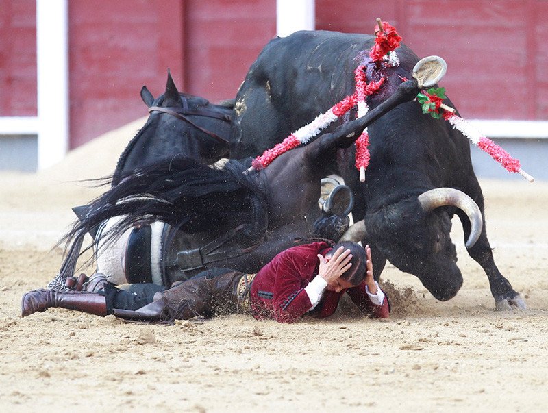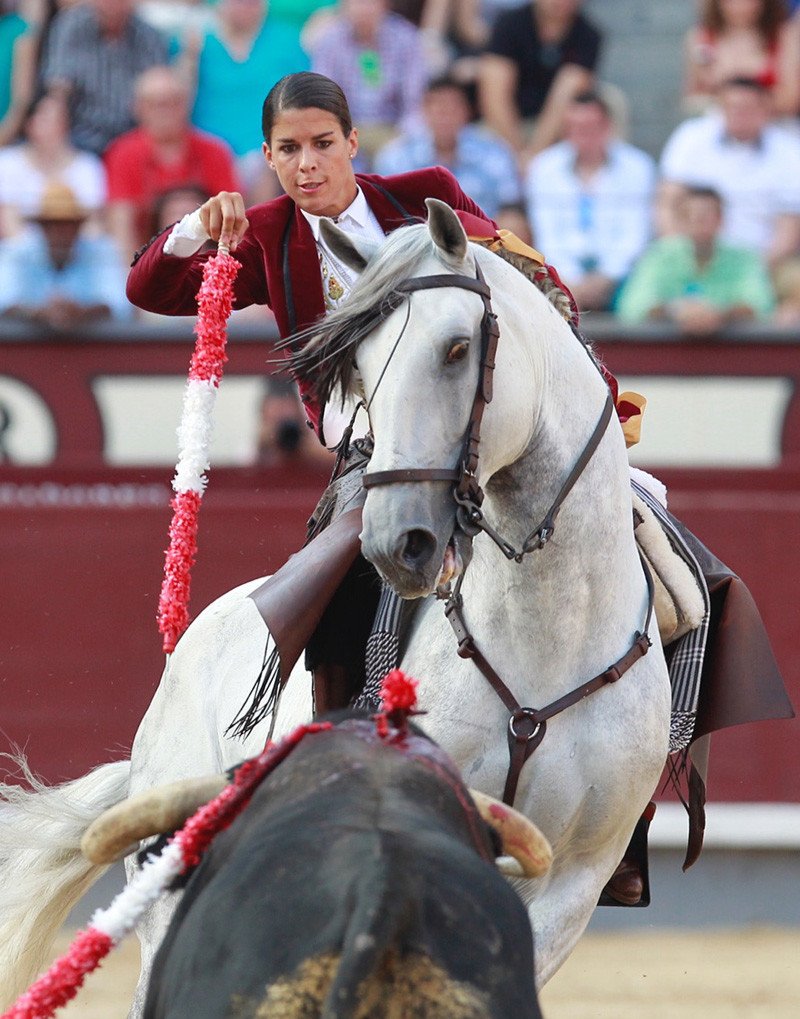 La torera tuvo suerte de evitar una seria herida después de que el toro estuviera a punto de cornearla, y logró picar tres veces al animal. Al final de la Feria de San Isidro, que se celebró en la plaza de toros Monumental de Las Ventas de Madrid, mató al toro y posó con su oreja.
