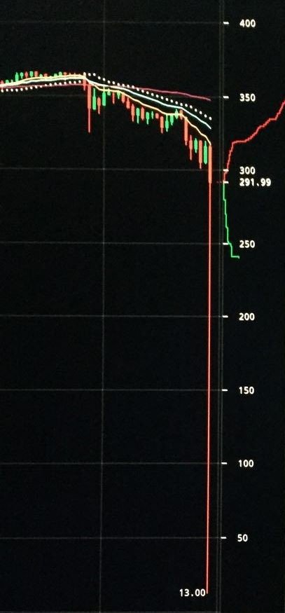En GDAX, una de las plataformas procesadoras, su valor rondaba los 318 dólares por ether y primero descendió hasta 224, un 29,4 %. Sin embargo, a las 20:30 GMT registró una caída relámpago hasta 13 dólares, un 96 % de desvalorización.