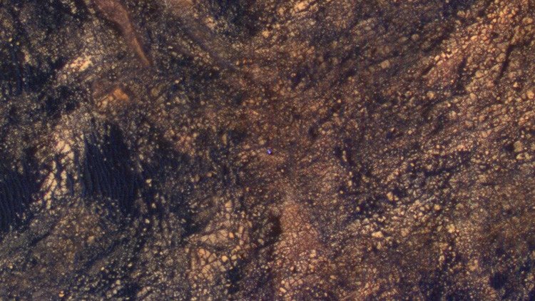 Ahora se conocen las características del terreno compuesto de rocas y arenas en tonos marrón y negro, en medio del cual reluce un diminuto punto azul que corresponde al vehículo. Su intensa coloración le permite destacar en medio del paisaje, aunque parece más azul de lo que realmente es.