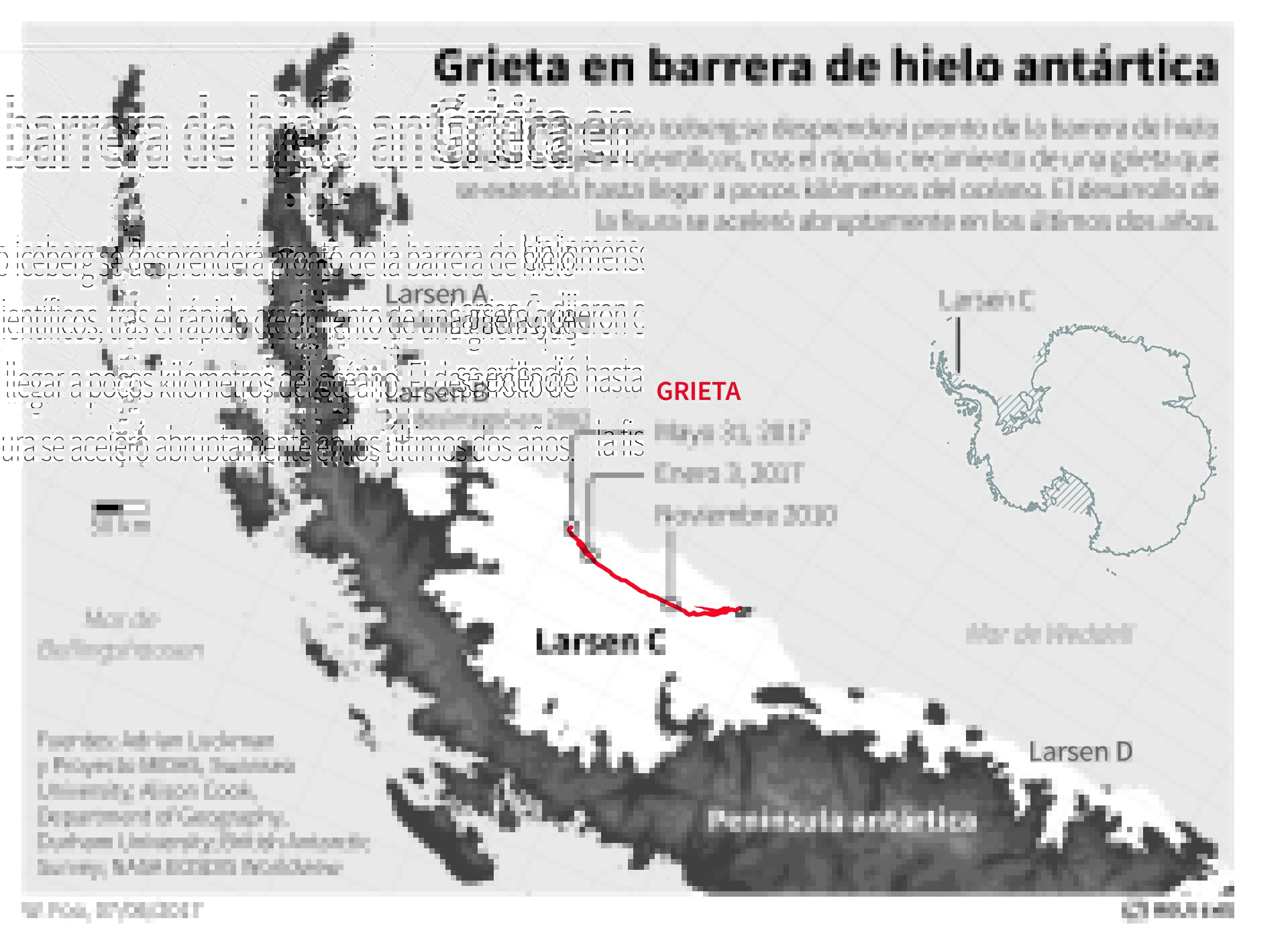 Finalmente, el geofísico refutó la idea generalizada de que el desprendimiento del Larsen C podría provocar un aumento de 10 centímetros en el nivel del mar. "Incluso si colapsa completamente, se estima que esto dará como resultado una contribución total al aumento del nivel del mar de aproximadamente 1 centímetro" debido a que "ya está flotando", aseveró.