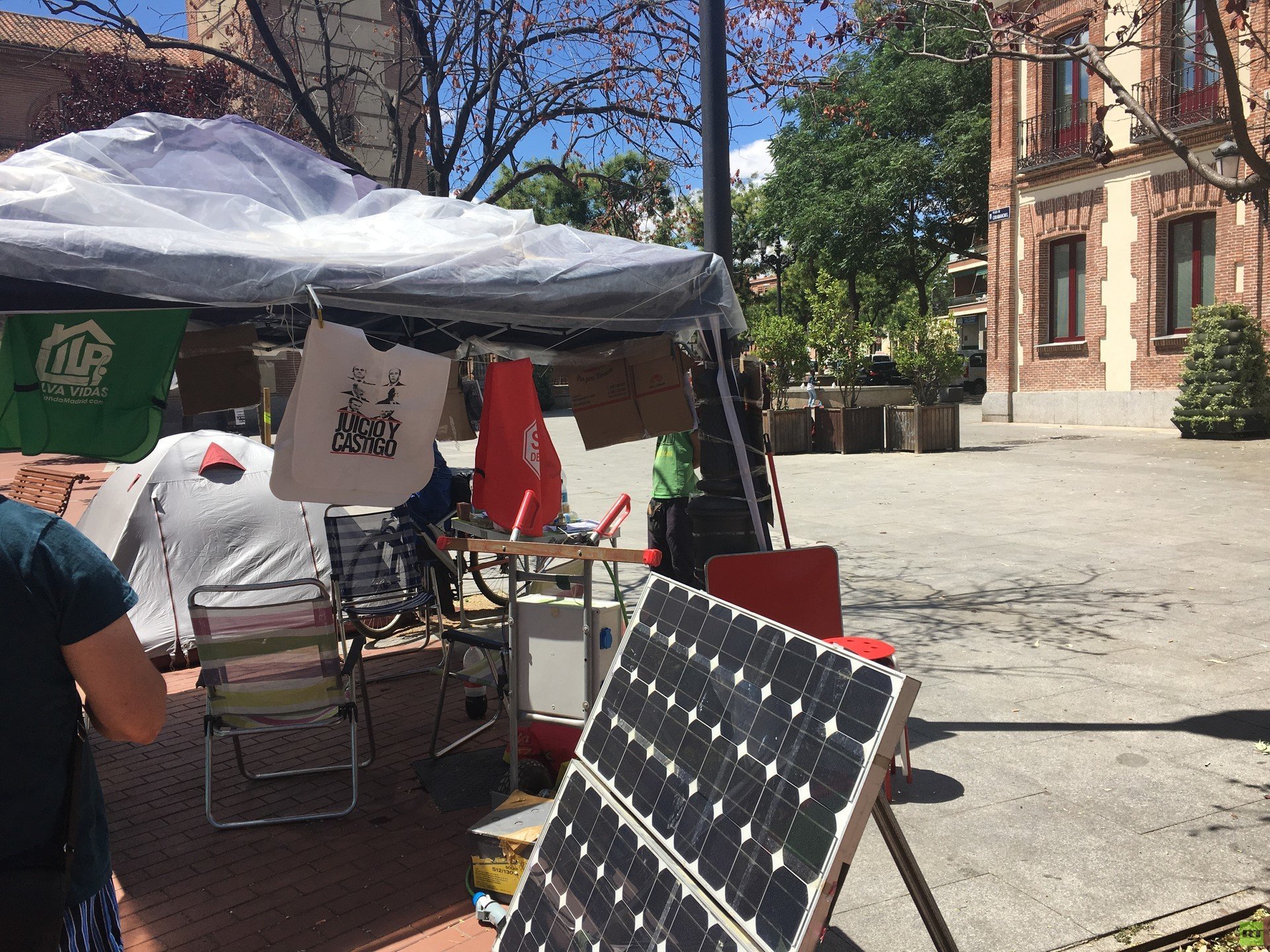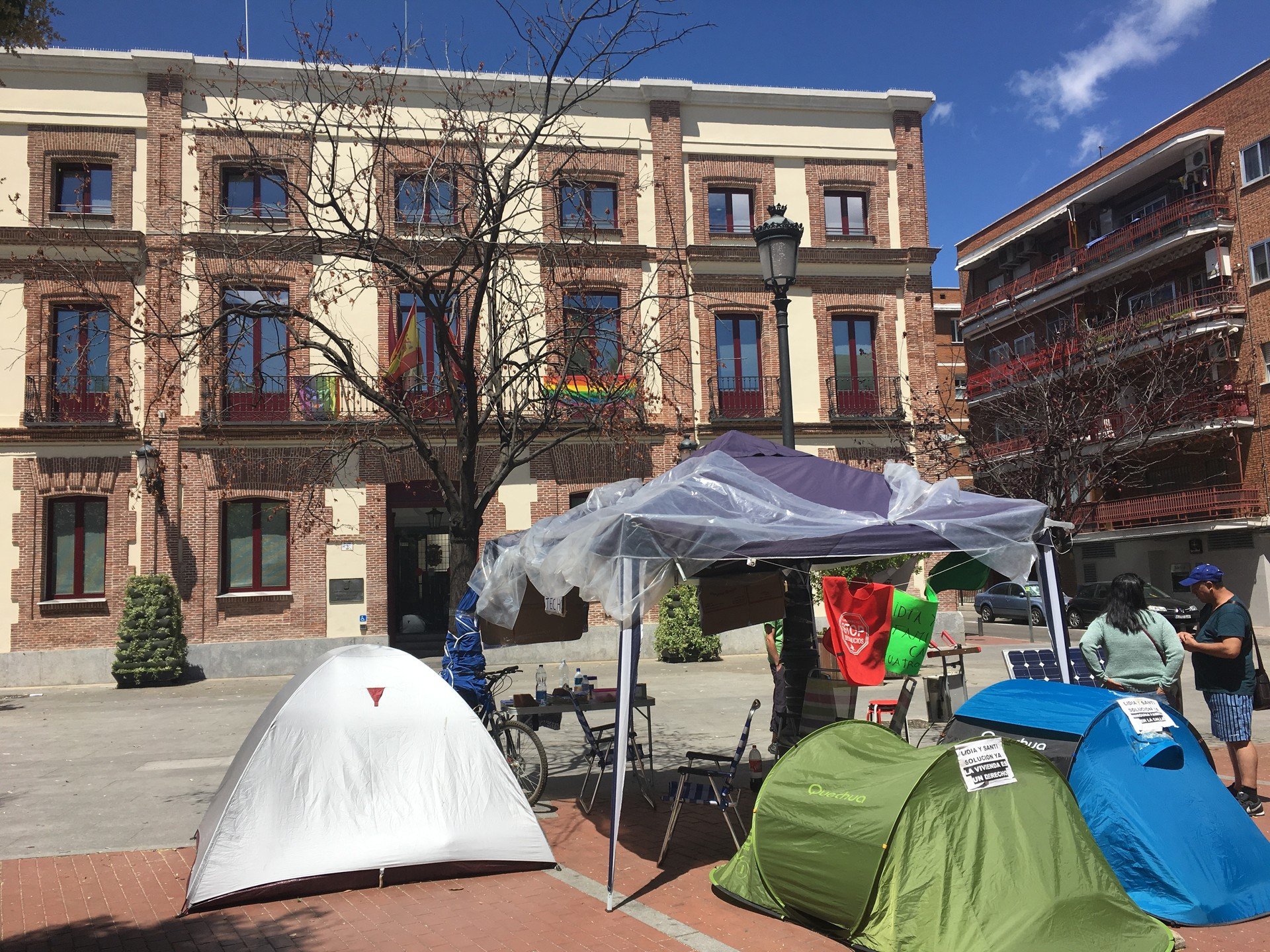 Llegamos a la Plaza de Carabanchel y encontramos una pequeña carpa adornada con carteles reivindicativos que denuncian la situación de Lidia y Santi, exigiendo una solución a su problema. Alrededor de la carpa hay tres pequeñas tiendas de campaña y una mesa para la recogida de firmas, en la también hay un bote para recoger aportaciones económicas. Mientras estamos allí, varios vecinos se acercan a interesarse por la familia y dejan su firma en la hoja de petición, y algunas monedas en el bote.