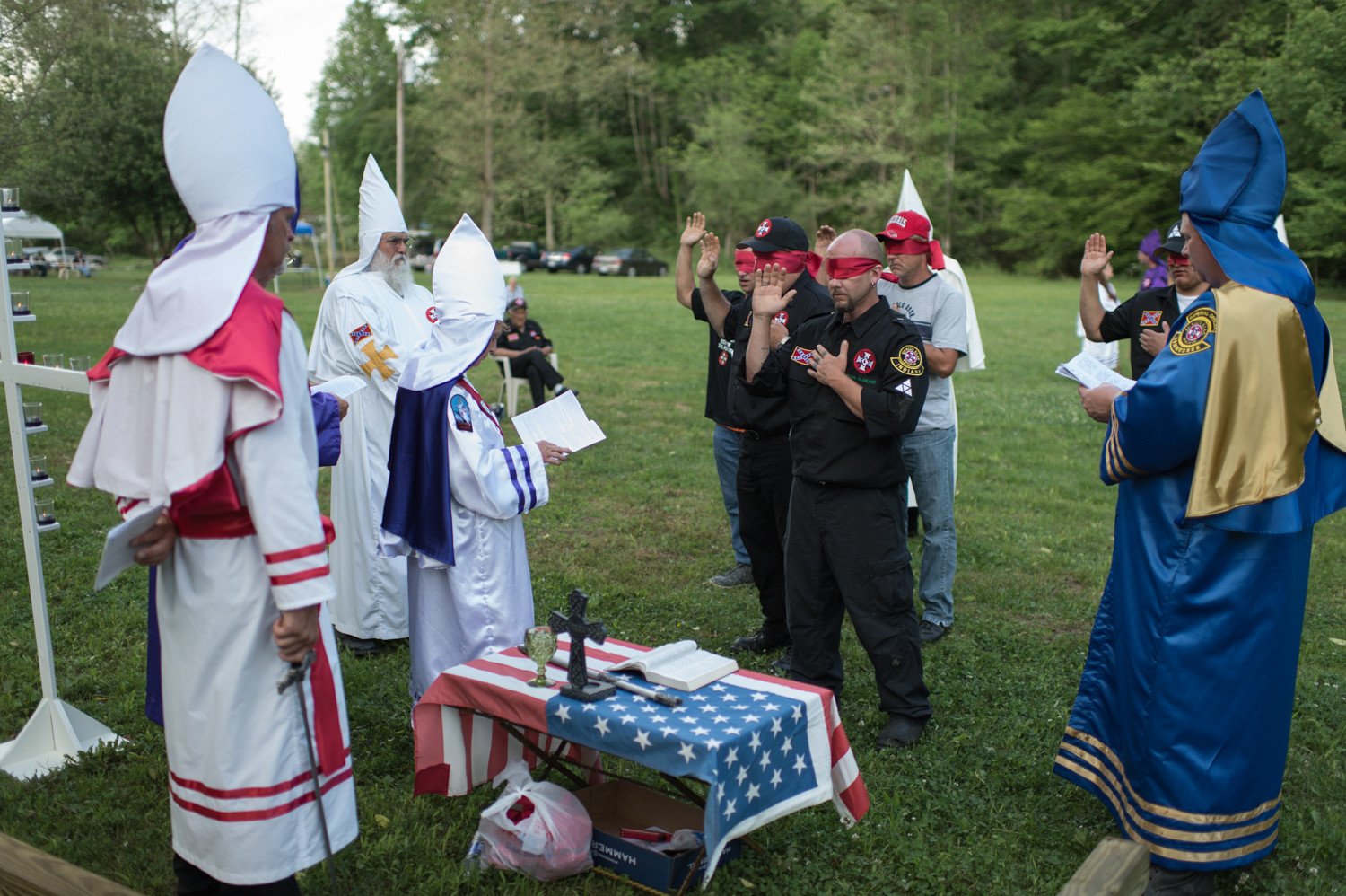 Los candidatos que aspiran a iniciarse como Caballeros del KKK prestan juramento como parte de un ritual de naturalización. Tienen los ojos vendados y los conducen por un bosque, a veces a un ritmo vigoroso. Les preguntan sobre el KKK y su historia, y tras hacer ciertos juramentos, son ungidos con aguas sagradas, les dan un toque de espada sobre ambos hombros y con una bendición se convierten en Caballeros. Los nuevos miembros son recibidos y acogidos por oficiales oficiantes.