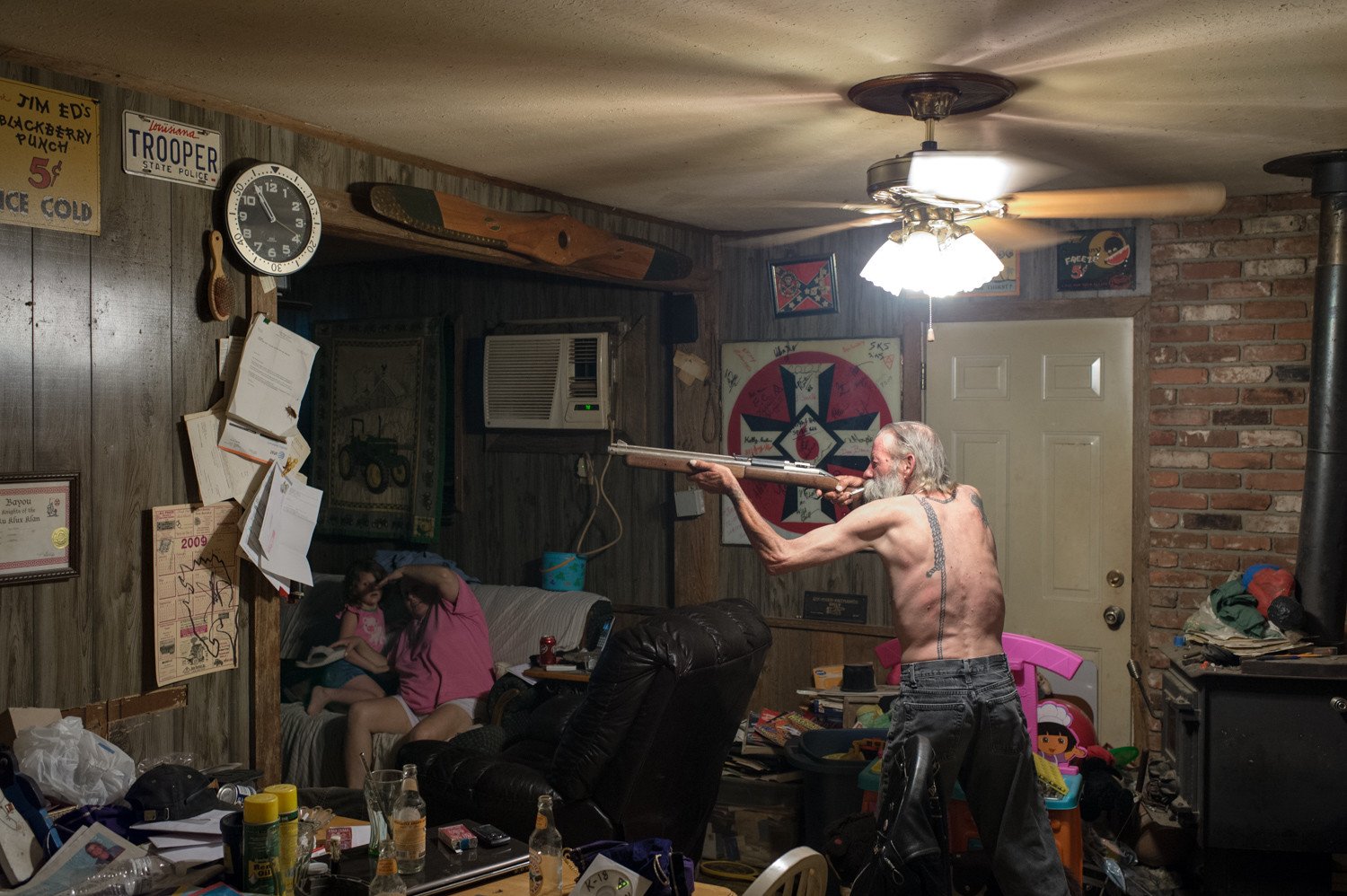 La siguiente imagen del fotoreportaje de Karen muestra cómo Carl, un 'mago imperial' del Ku Klux Klan con sede en el reino del sur, apunta con su pistola de perdigones a una cucaracha mientras su esposa y su ahijada tratan de evitar un posible rebote.