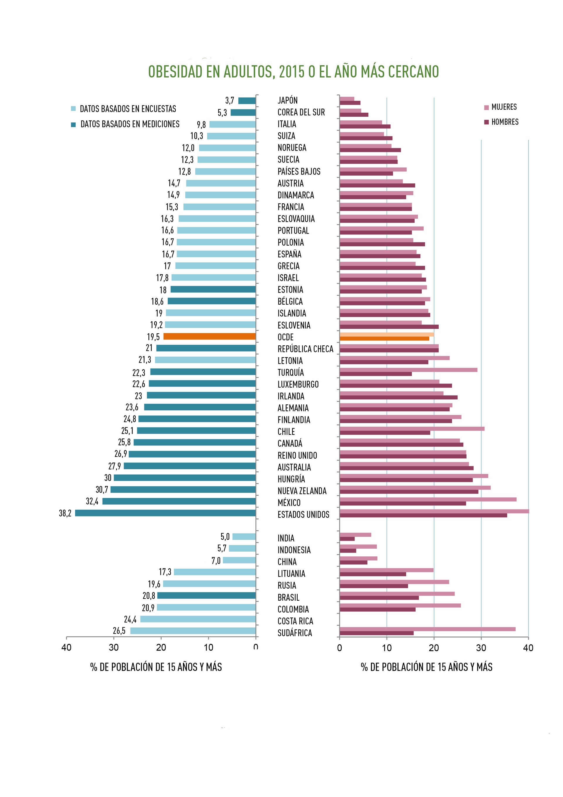 Otro país hispanoamericano que figura entre los primeros de la lista es Chile, con un promedio del 25,1%. Tanto en el caso de México como en el de Chile se observa una proporción de la obesidad marcadamente más elevada en mujeres que en hombres.