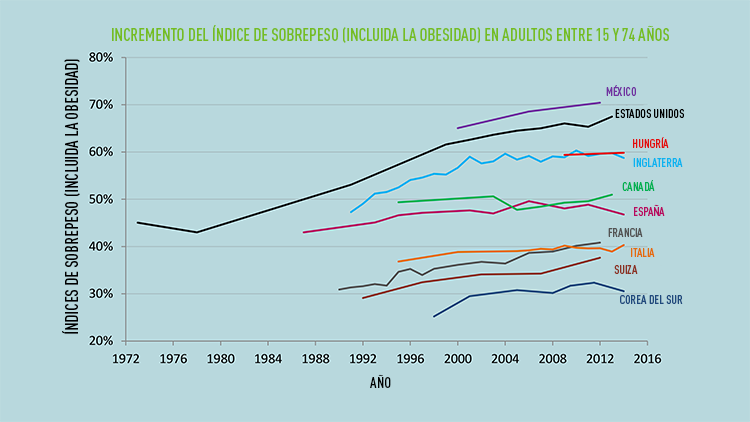 Un reciente informe de la Organización para la Cooperación y el Desarrollo Económicos (OCDE) coloca a México como el país con la mayor tasa de personas con sobrepeso –definida por la OMS como un índice de masa corporal (IMC) igual o superior a 25– con una prevalencia que supera el 70%. En segundo lugar figura EE.UU., que muestra un pronunciada aceleración en los últimos años. Entre los países que lograron reducir el índice de sobrepeso se encuentran Inglaterra, Corea del Sur y España.