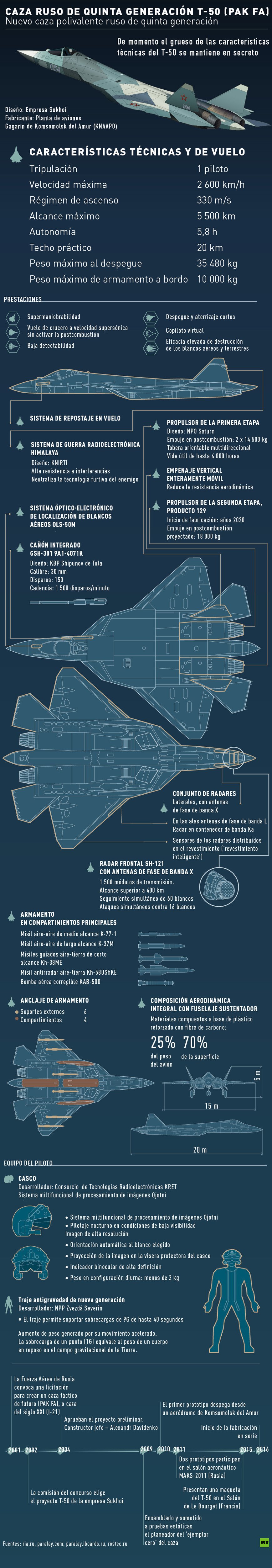 Mientras tanto, Rusia está trabajando activamente en los cazas de la siguiente generación, la sexta, tal y como anunció el director general adjunto del consorcio de Tecnologías Radioelectrónicas KRET, Vladímir Mijéyev, en una entrevista al canal de televisión Zvezdá en el salón aeroespacial MAKS-2017.