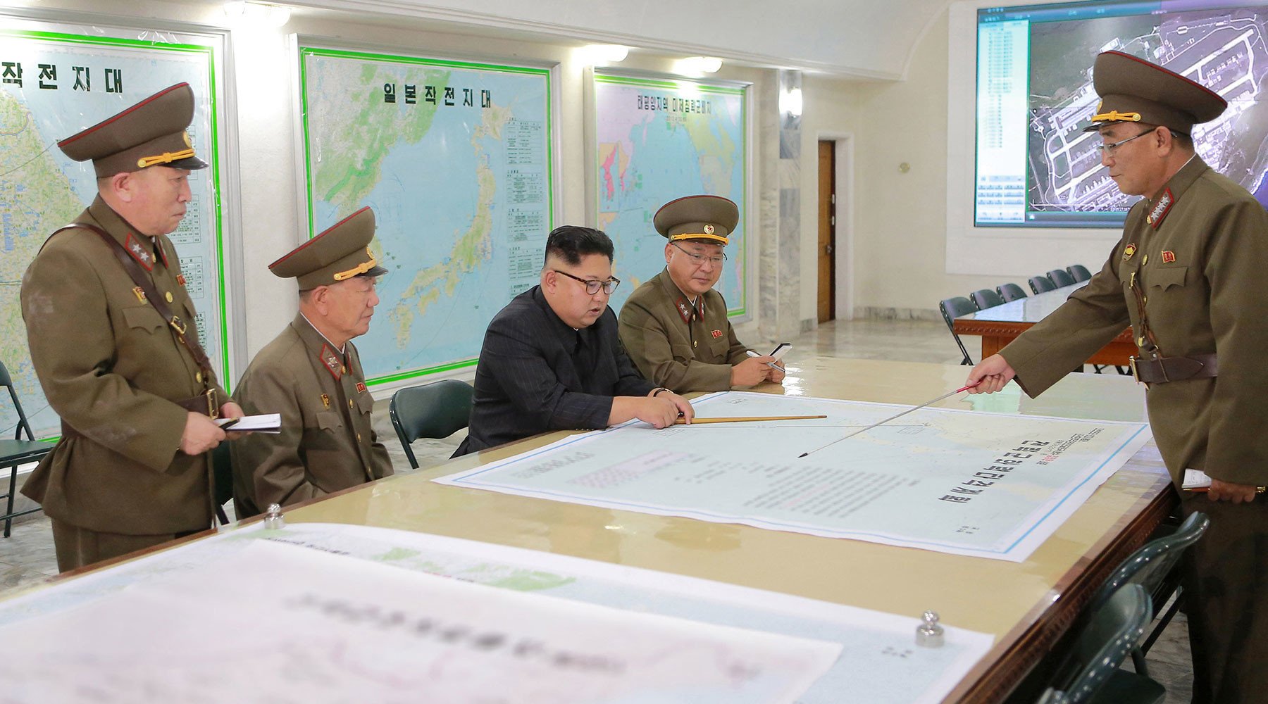 En las instantáneas se ve a Kim Jong-un reunido con altos militares norcoreanos mientras señala con una vara un mapa en el que se lee "Plan de Ataque de Fuego de la Fuerza Estratégica". El mapa muestra la trayectoria de un vuelo de misiles que aparentemente comienza en la costa este de Corea del Norte, continúa sobre Japón y termina cerca de Guam.