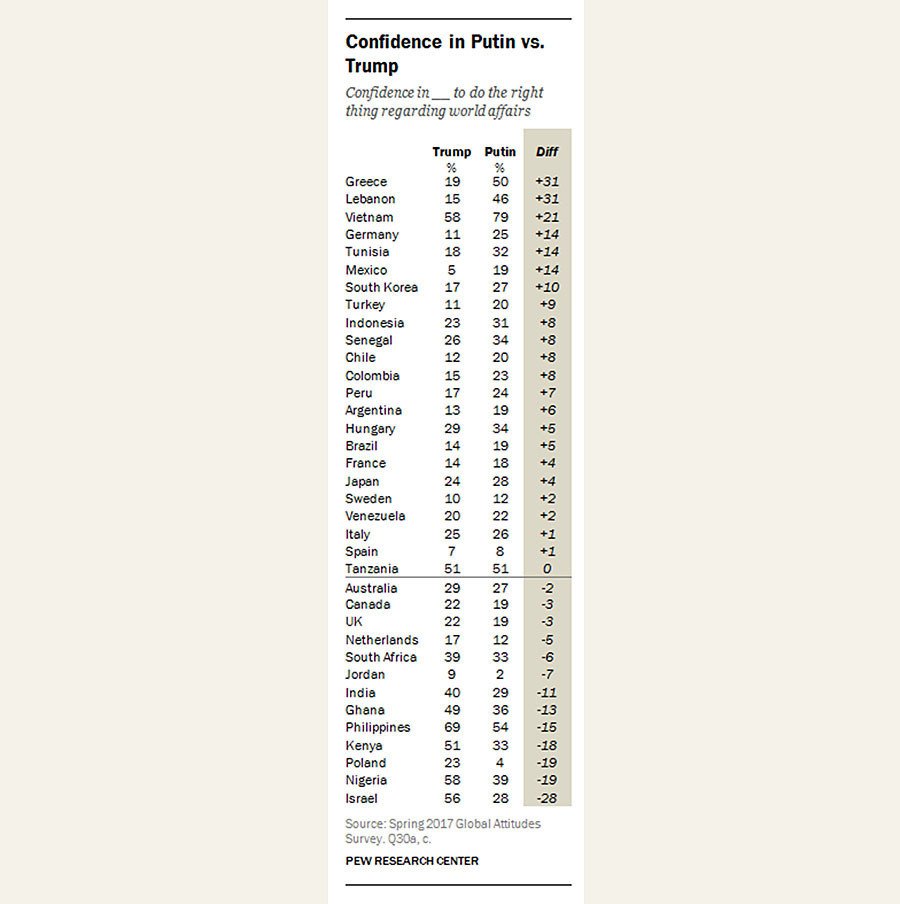 En Chile, Argentina, Perú, Venezuela, Colombia, México y Brasil también han manifestado más confianza en el presidente ruso. Mientras, aliados tradicionales de Washington como Australia, Canadá y el Reino Unido, entre otros, han mostrado más inclinación hacia Trump.