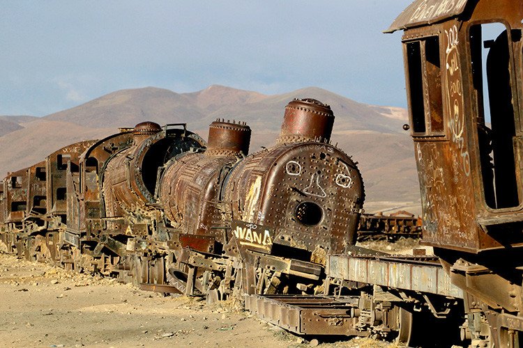Ubicado en el suroeste de Bolivia, a 3 kilómetros del municipio de Uyuni, este cementerio surgió por los numerosos trenes que abandonaron en el lugar las compañías mineras.