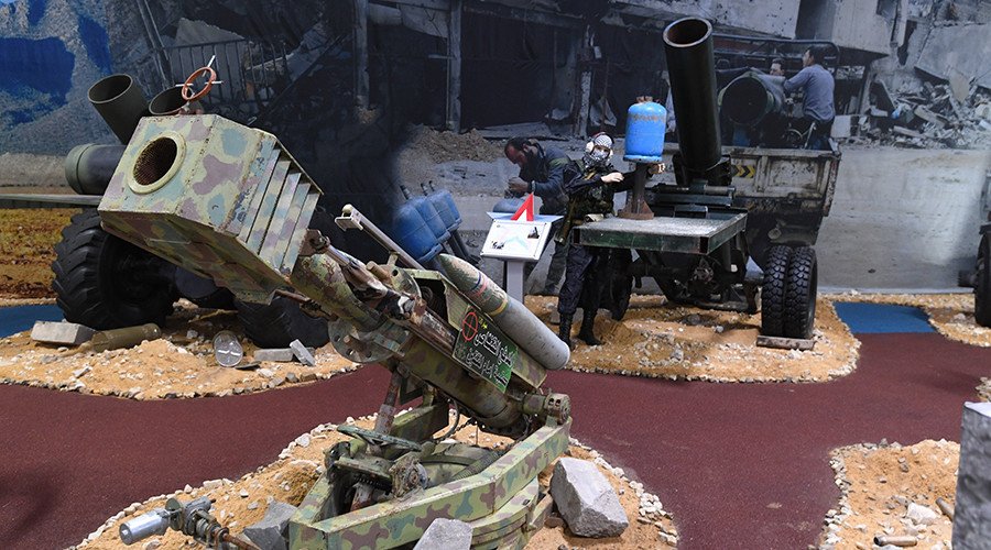 Entre las armas expuestas figuraban cañones, morteros y lanzamisiles compuestos con materiales improvisados, así como rifles, minas, proyectiles cargados con gases tóxicos, máscaras antigás y vehículos.