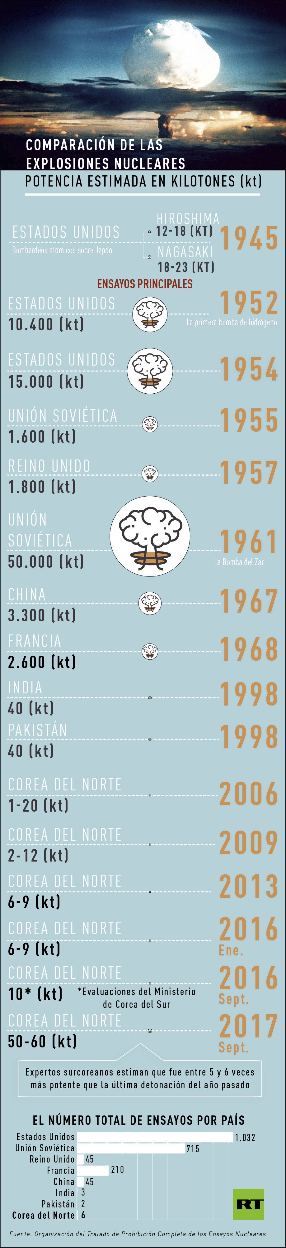 Japón ha vuelto a actualizar sus evaluaciones de la última prueba nuclear de Corea del Norte, realizada el pasado 3 de septiembre, informa AFP. Según expertos japoneses, la potencia estimada del ensayo fue de alrededor de 160 kilotones, diez veces mayor que la de la bomba estadounidense que destruyó la ciudad japonesa de Hiroshima en 1945.