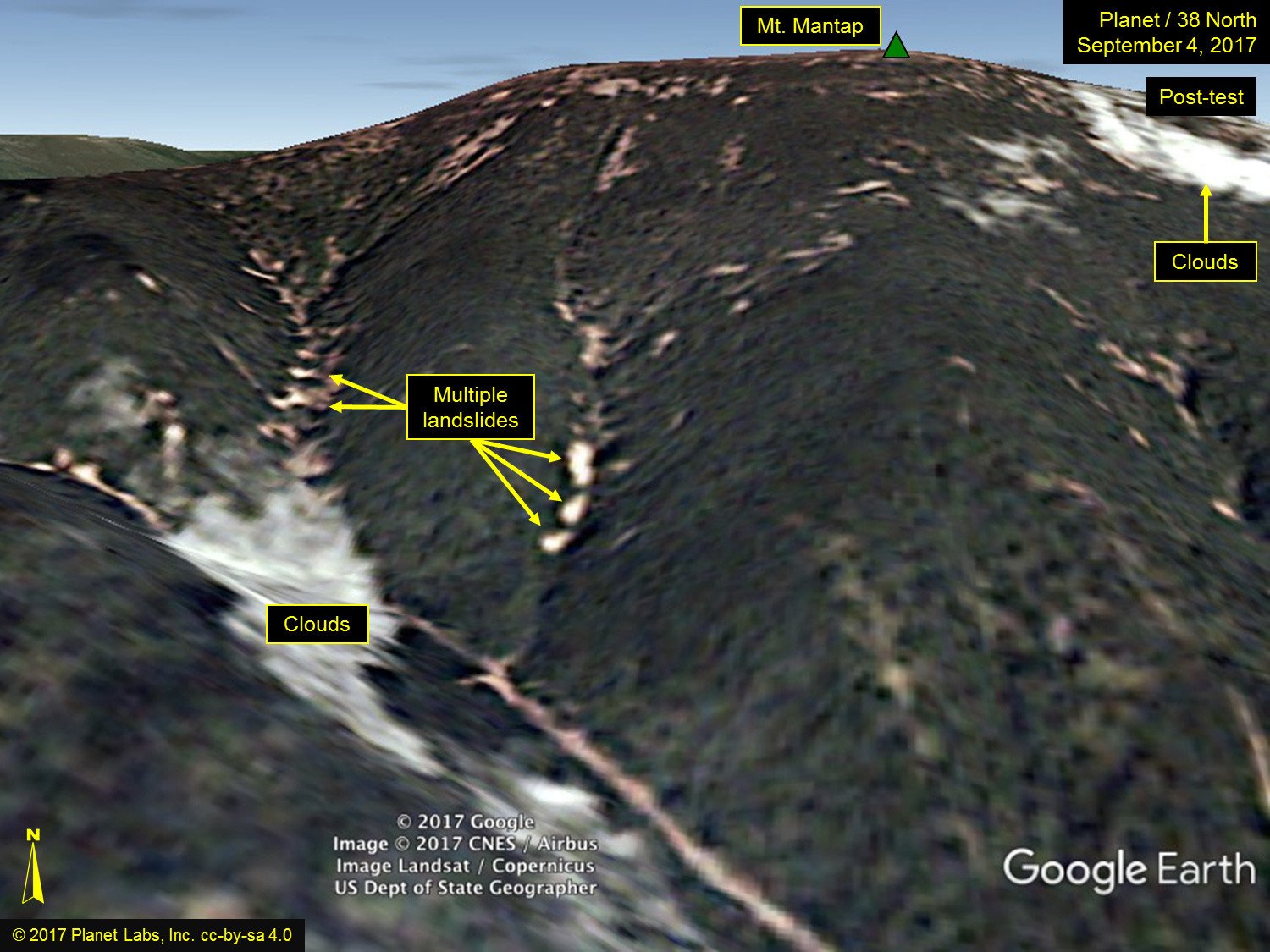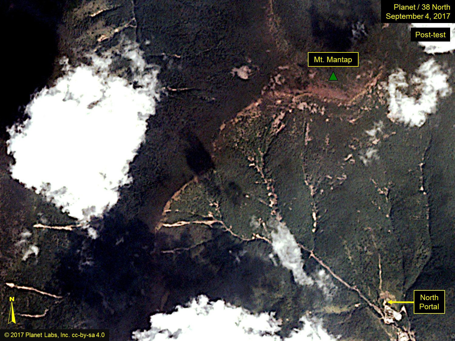 Imágenes satelitales del sitio de pruebas nucleares de Punggye-ri, en Corea del Norte, evidencian "numerosos y grandes deslizamientos de tierra" alrededor del sitio, informa un análisis del portal 38 North. La más afectada por los temblores es la zona alrededor del monte Mantap, que tiene 2.205 metros de altitud.
