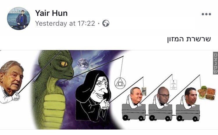 El hijo del primer ministro israelí ha sido objeto de críticas tras colgar en su perfil de la red social Facebook una caricatura de cariz antisemita. El dibujo que Yahir Netanyahu describió como 'Cadena de Alimentación' muestra al multimillonario estadounidense George Soros frotándose las manos junto a críticos del primer ministro israelí. El 'post' del vástago de Benjamín Netanyahu ha despertado una ola de duras reacciones en Israel y fue eliminado un día después de su publicación.