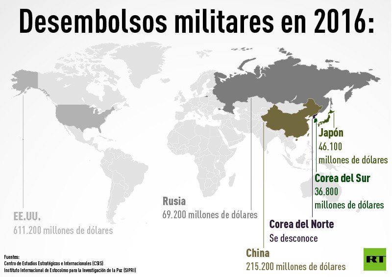 Según esta información, en lo que respecta a los multimillonarios gastos de los Estados en la región el líder es EE.UU., con 611.200 millones de dólares gastados en 2016 para mantener el potencial militar del país. Respecto al número de personal militar, el índice más alto lo tiene China, ya que dispone de 1.600.000 militares, en comparación con los que posee Japón: 151.000, por ejemplo.