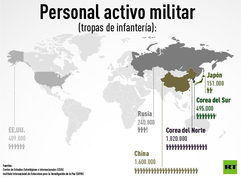 Entre los datos proporcionados se tiene en cuenta la cantidad de militares en la zona, el personal activo de las fuerzas armadas y la cantidad de equipamiento bélico (tanques, aviones de combate, buques de guerra, submarinos y helicópteros) de estos 6 países.