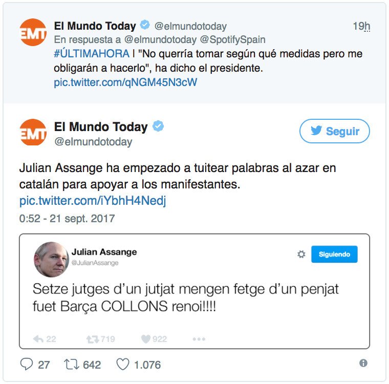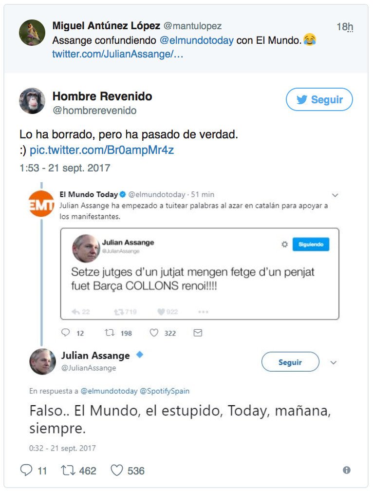 En concreto, el medio humorístico bromeaba acerca de un falso tuit de Assange en apoyo a los manifestantes catalanes:
