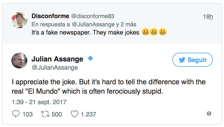 "Aprecio la broma –respondió Assange en otro tuit– pero es difícil captar la diferencia con el verdadero "El Mundo", que suele ser ferozmente estúpido". Esta explicación, sin embargo, no le ha librado de las múltiples burlas de los tuiteros.