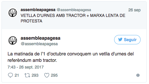 Una sindicato catalán de agricultores llamado "Assemblea Pagesa" ha convocado un aparatoso acto de apoyo al referéndum soberanista de Cataluña. En concreto, han animado a utilizar "todos los tractores del país" para "velar las urnas" durante el dia el dia 1 de Octubre, aparcándolos "en las proximidades de los colegios electorales". Con esta movilización pretenden contrarrestar los esfuerzos del gobierno de España por impedir la celebración de la consulta.