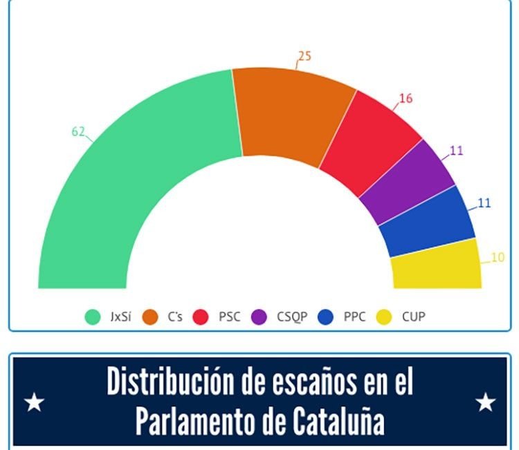 - Junts pel Sí (JxSí): Se trata de una coalición electoral de varios partidos de la derecha y la izquierda creada para concurrir a estos comicios. Concretamente, estas formaciones son Convergencia Convergencia Democrática de Cataluña - actualmente PDeCAT -, Esquerra Republicana de Catalunya (ERC), Demócratas de Cataluña y Moviment d’Esquerres. Obtuvo 62 diputados.