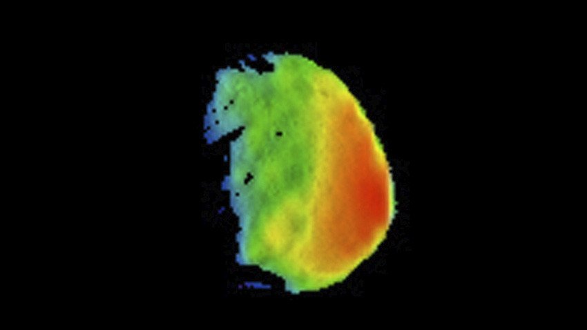 Tras combinar datos de longitud de onda visible e infrarrojos, usando la cámara del Sistema de Imágenes de Emisión Térmica (THEMIS), los científicos obtuvieron una imagen codificada con distintos colores que representan el cambio de temperaturas superficiales del satélite a lo largo de un día. Según los investigadores, esto proporciona información sobre la rapidez con la que se calienta el suelo y la textura de la superficie.