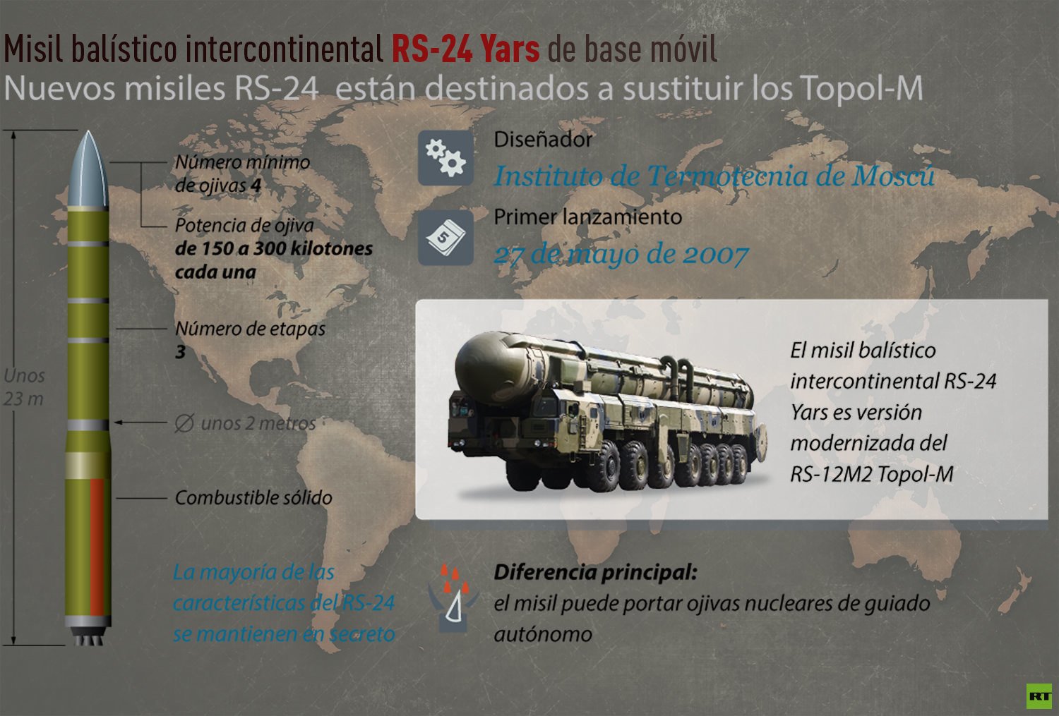 Los misiles Yars, con un alcance de 11.000 km, están dotados de ojivas de reentrada múltiple y sistemas avanzados de guiado. Los Yars están destinados a reemplazar por completo a todos los sistemas Topol y Topol-M antes del año 2021.