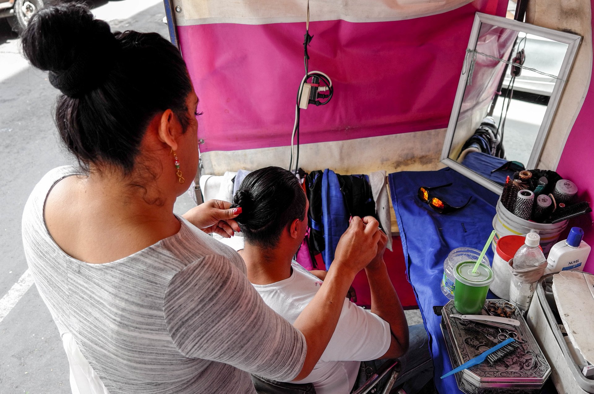 Un cliente llega al puesto de Wendy, se sienta en la silla plástica y entrega su larga cabellera a los designios de la peluquera. Ella continúa hablando de sí misma y abre un pequeño 'bobby pin' con los dientes: "Entreno dos veces a la semana: martes y viernes, y lucho, a veces, viernes, sábado y domingo. Aquí trabajo todos los días, menos los domingos, de 10:30 de la mañana a 6:00 de la tarde, y luego en la otra estética de 6:30 de la tarde a las 11:00 de la noche. Nunca estoy parada. Me encanta el dinero, me fascina el dinero, pero me gusta trabajar. Yo vengo de una familia muy muy muy humilde, ¿sí me entiendes? Y no te voy a decir que ahorita somos ricos, pero la verdad es que unos frijolitos nunca nos hacen falta".