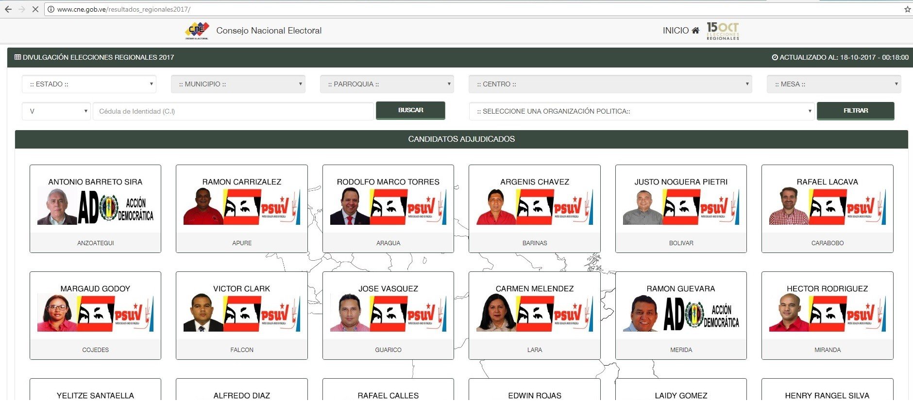 El chavismo obtuvo 78 % de las gobernaciones en disputa y más de 50 % de la voluntad del electorado a escala nacional. Esta "victoria tajante", como la denominó el presidente venezolano Nicolás Maduro, que ocurrió en medio de una crisis económica caracterizada por altos precios de productos básicos y escasez de algunos alimentos y medicamentos, sorprendió a algunos políticos opositores que rápidamente alegaron fraude.