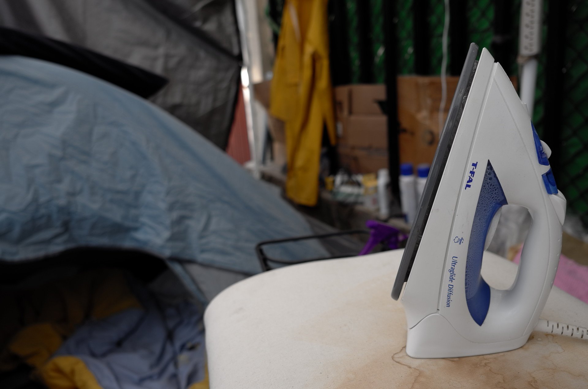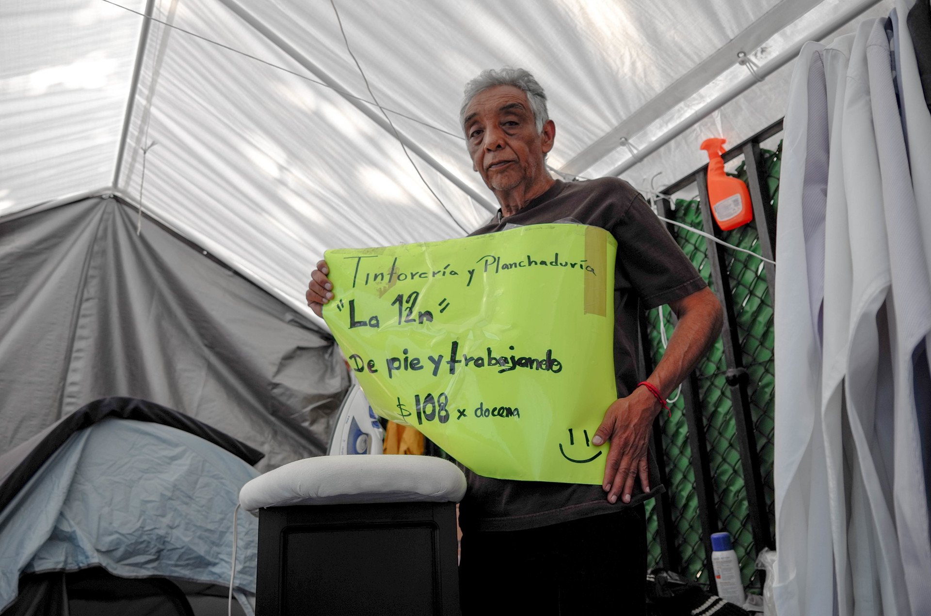 Enrique ubicó su negocio temporal dentro de la carpa improvisada donde también duerme. El espacio es reducido, pero el olor a spray para planchado le da una sensación de amplitud inusual, límpida. Sobre una percha están las camisas alineadas en ganchos dispuestos en fila y, en el centro del recinto reposa boca arriba la panza acerada de una plancha.