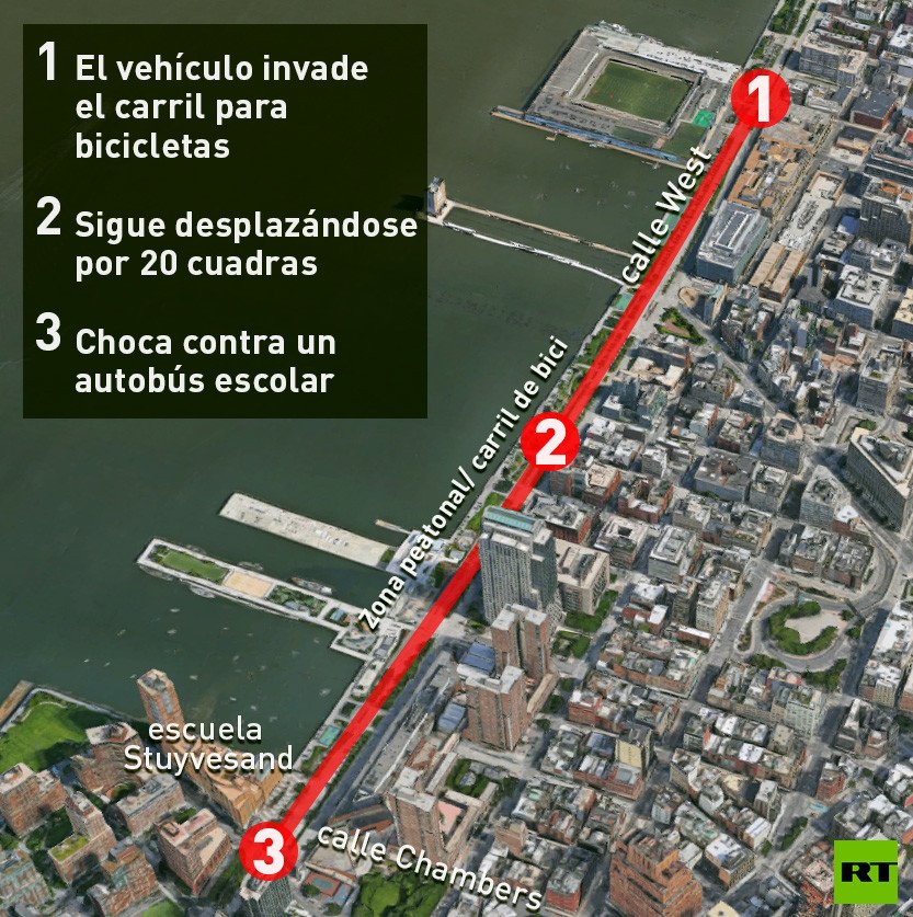 Una camioneta invadió este martes un concurrido carril para bicicletas en la calle West situada cerca del World Trade Center de Nueva York. El vehículo siguió desplazándose hasta que chocó contra un autobús escolar, después de lo cual el conductor salió de la camioneta con armas falsas y fue herido por disparos de la Policía.
