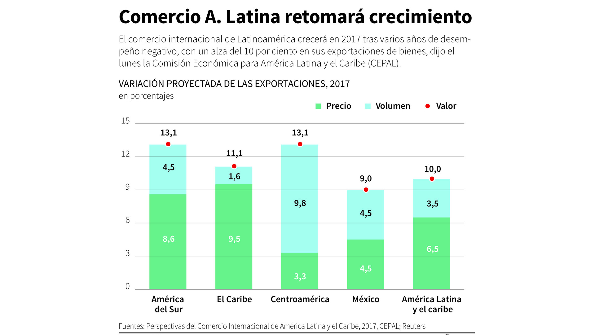 Bajo el título 'Perspectivas del Comercio Internacional de América Latina y el Caribe, 2017', el documento del organismo económico precisa que la recuperación impactará en los precios de la canasta de exportación y en el valor de sus envíos de bienes al exterior. Además, se espera que tras cuatro años de decrecimiento las importaciones también aumenten un 7% durante 2017.