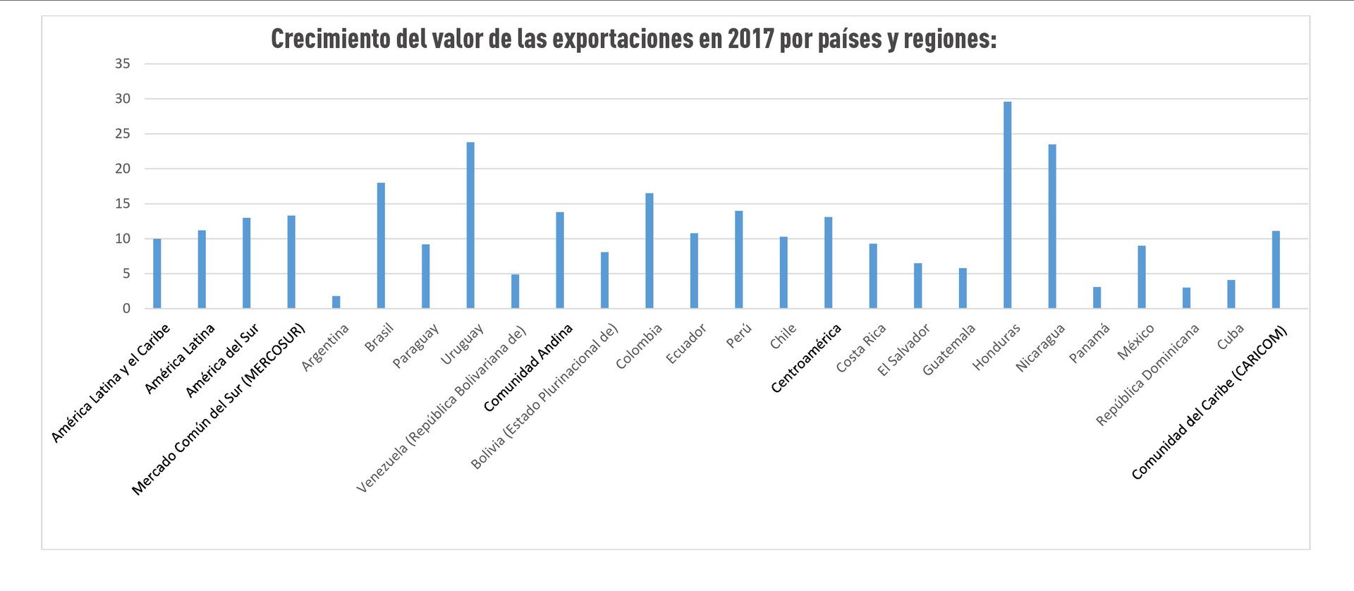 La CEPAL –página 55 del informe– precisó los países cuyas exportaciones experimentaron un mayor crecimiento durante 2017 (Honduras, Nicaragua y Uruguay), así como el total de los bloques regionales: América Latina y el Caribe, 10%; América Latina, 11,2%; América del Sur; 13%; Mercosur, 13,3%; Comunidad Andina, 13,8%; Centroamérica, 13,1%; y Caricom, 11,1%.