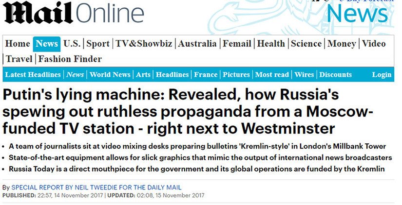 Bajo un larguísimo titular —"La máquina de mentiras de Putin: Revelamos cómo Rusia arroja propaganda despiadada desde una emisora de televisión financiada por Moscú en las inmediataciones de Westminster"— el diario lanza su ataque contra RT, confirmando las tendencias rusófobas que algunos medios expresan abiertamente en Occidente.