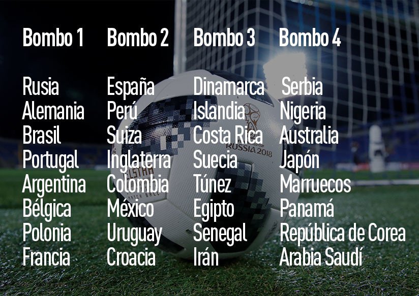 La Federación Internacional de Fútbol Asociación (FIFA) ha anunciado este jueves la composición de los bombos para el sorteo final de la Copa Mundial de Rusia 2018, que tendrá lugar el próximo 1 de diciembre.
